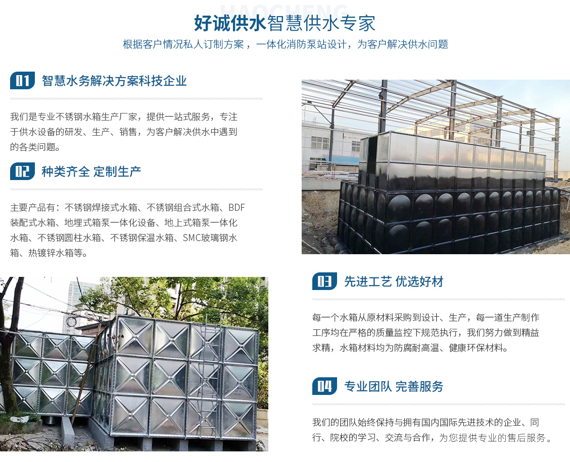 安徽好誠供水設(shè)備制造有限公司是一家集設(shè)計(jì)、研發(fā)、制造、銷售、售后為一體的專業(yè)不銹鋼水箱生產(chǎn)廠家,以科技力量立足于社會(huì)。近幾年來致力于供水設(shè)備、水箱的研究與開發(fā)。主要產(chǎn)品有:不銹鋼焊接式水箱、不銹鋼組合式水箱、BDF裝配式水箱、地埋式箱泵一體化設(shè)備、地上式箱泵一體化水箱、不銹鋼圓柱水箱、不銹鋼保溫水箱、SMC玻璃鋼水箱、熱鍍鋅水箱。對于傳統(tǒng)混凝土水箱的改造(即不銹鋼內(nèi)貼水箱),老舊水箱的拆除、更換、...